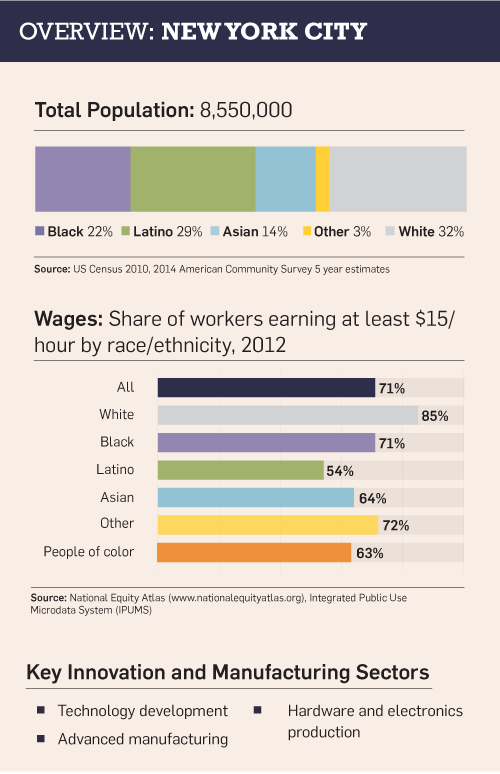 Central to this industrial plan is a commitment to address inequality: “Mayor de Blasio … challenged city government and city agencies to work with him on this broader, bolder vision of thinking about equity,” said Miquela Craytor, Director of Industrial Policy at NYCEDC. “We now have license, ‘to help connect certain neighborhoods that have been left out to our efforts.’”